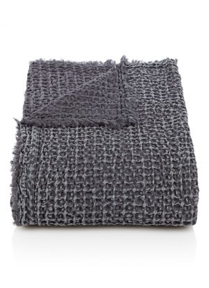 Mooi detail van een bed met beddengoed van House in Style. Een prachtig lichtgrijs linnen dekbedovertrek in combinatie met warme, grove plaids in antraciet.
