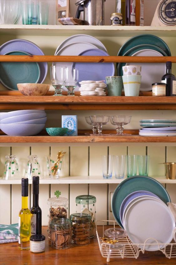 “If you have it, flaunt it”. Het mooiste servies verdient een ere-plaats in de keuken in plaats van dat het weggestopt wordt in een keukenkastje. En hoe heerlijk is het als je net zo'n bonte verzameling aan servies mag laten zien thuis? Het meeste servies uit dit beeld komt uit de Nostalgia-serie van Sissy Boy Homeland. Een mooie tijdloze set van koffiemokken, pastaborden, gebaksbordjes en dinerborden in zachte blauw-, groen- en grijstinten.